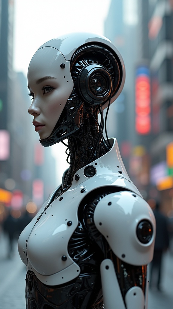 Ultra-realistic photograph of a futuristic police robot in a bustling modern city, infused with cyberpunk aesthetics; featuring a detailed face with intricate and symmetrical designs. The robot showcases smooth, mechanically advanced features, blending digital 3D artistry with hard surface, real-time VFX. Its ultra HD and HDR side profile highlights an abstract metal sculpture vibe. While maintaining a sense of illustration and cartoon-like charm, the cyborg's clothing incorporates asymmetry and unconventional design elements. The scene includes hints of blurred, distorted elements, suggesting a sense of drama and movement. Despite an intentional inclusion of odd proportions and deformations for artistic effect, the image remains a striking depiction of futuristic character design.