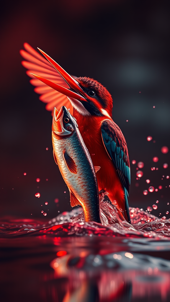 Ultra realistic photography of a stunning kingfisher snatching a fish, vibrant red hues, dramatic cinematic lighting, captured with a 90mm lens, showcasing a 16:9 aspect ratio, with a sharp focus on the splashing water and sparkling droplets.