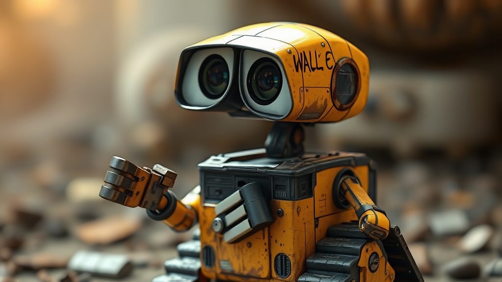 Ultra-realistic photorealistic image of a charmingly quirky baby Wall-E, featuring intricate details, 16k resolution, HDR effects, enhanced with raytracing for depth, slightly soft focus for an endearing appeal, artistic sketches for a playful touch, whimsical imperfections in anatomy and proportions, balanced between clarity and an artistic lowres effect, capturing an essence of delightful curiosity with a hint of imaginative mischief.