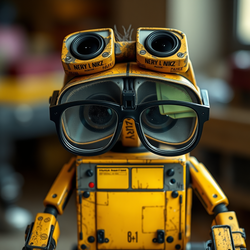 Ultra-realistic photorealistic image of an adorable nerdy baby Wall-E with exaggerated oversized glasses, high definition detail, HDR, playful light scattering, intentional rough sketches visible, slightly distorted anatomy and whimsical proportions, soft focus around edges, balance of low and normal quality elements, creatively imperfect yet charming features.