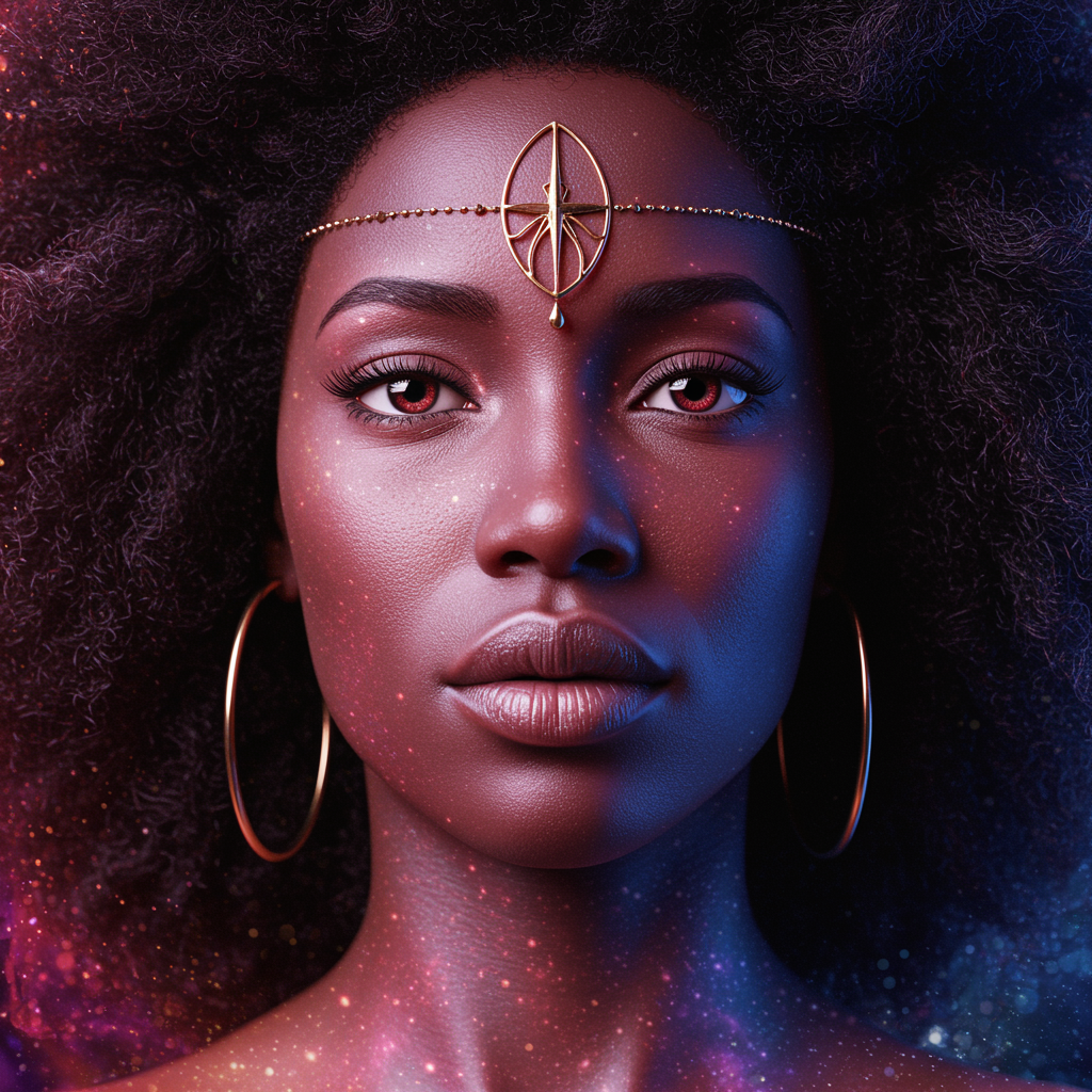 Ultra-realistic portrait of a black woman emanating cosmic energy, vibrant and colorful, with a beautifully symmetrical face and a kind, serene expression. Her realistic, round eyes are captivating, and the portrait is intricately detailed and elegant. The digital painting captures a dreamy, magical atmosphere, inspired by artists like Artgerm, Greg Rutkowski, and Alphonse Mucha. The focus is smooth and sharp, creating an illustration that feels both ethereal and grounded. This stunning piece is presented in high resolution, with no visual distractions or errors, celebrating the beauty and complexity of its subject.