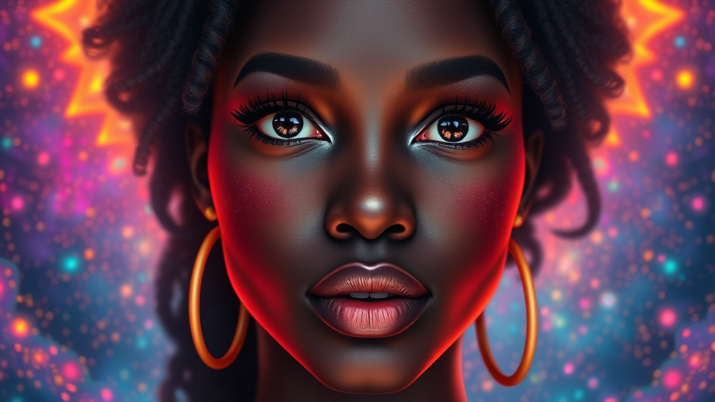 Ultra-realistic portrait of a black woman embodying cosmic energy, showcasing a burst of vibrant colors. Her face is beautifully symmetrical, exuding a nonchalant and kind demeanor. Large, realistic eyes add to her captivating presence. The image is tone-mapped and intricately detailed, reflecting an elegant digital painting style. Inspired by ArtStation concept art, the focus is sharp and the atmosphere dreamy and magical. The artistic influence comes from Artgerm, Greg Rutkowski, and Alphonse Mucha, with ultra-high resolution in 4k and 8k. The scene avoids distractions such as text, low resolution, and artifacts, ensuring a stunning, seamless, and focused depiction.