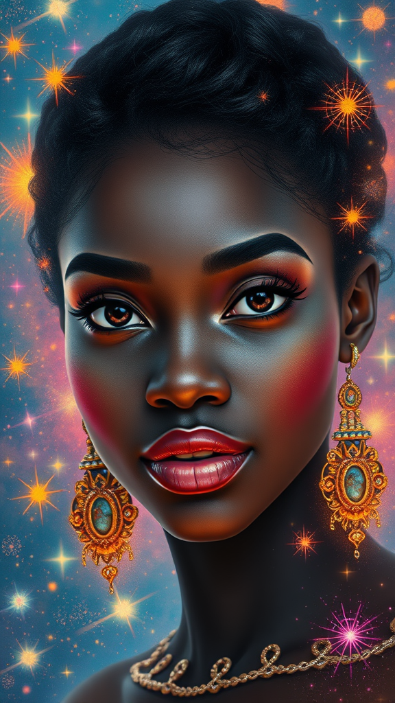Ultra-realistic portrait of a black woman with cosmic energy embracing colorful bursts, her face beautifully symmetrical with a nonchalant and kind gaze, featuring realistic round eyes. Elegantly detailed digital painting with intricate design elements, showcased in a dreamy and magical atmosphere. Capturing the essence of art by Artgerm, Greg Rutkowski, and Alphonse Mucha, this concept effortlessly combines smooth and sharp focus, presenting an exquisite illustration suitable for showcasing on ArtStation. Rendered in high-resolution 4k or 8k, the artwork emphasizes artistic clarity and richness, avoiding distortions or imperfections such as low quality, duplication, or anatomical inaccuracies like extra limbs or mutated features.