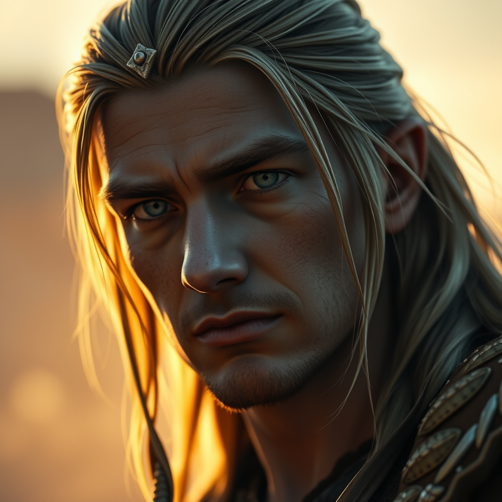 Ultra realistic portrait of Legolas from The Lord of the Rings, dramatic lighting, soft glow of dawn, cinematic atmosphere, weathered expression, low angle perspective, artstation trending style, 4k resolution, hyper realistic texture, intense focus, intricate details, rendered in unreal engine 5, cinematic quality, artistic masterpiece.