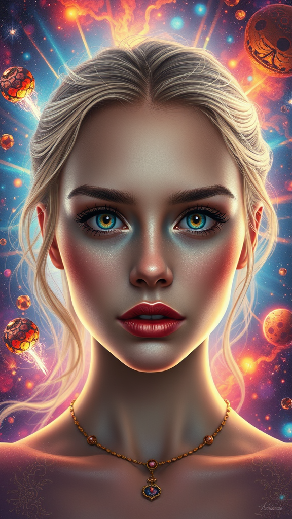 Ultra-realistic portrait of Scarlett Leithold enveloped in cosmic energy, vibrant and colorful painting burst, her symmetrical face exudes a kind and serene nonchalance, with realistic, captivating round eyes. Tone-mapped and intricately detailed, this elegant digital painting captures a smooth, sharp focus, reminiscent of artstation concept art. With inspiration from Artgerm, Greg Rutkowski, and Alphonse Mucha, the dreamy, magical atmosphere is heightened with an ethereal glow and ornate textures, resulting in a masterpiece of illustration.
