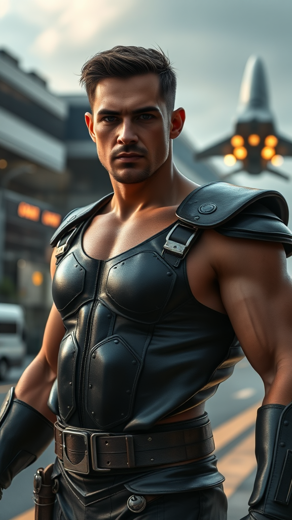 Ultra-realistic portrait photograph showcasing a full-body view of a 28-year-old Israeli male with a dominant presence. He exhibits a perfect, muscular physique with a hairy chest, smaller head, and shiny hair. The scene is set with a wide cinematic field of view, capturing him at a spaceport with a sci-fi ship taking off in the background. The lighting is natural yet moody, enhancing the cinematic quality. He's clad in detailed plate leather armor, emphasizing the fine textures and natural elements, in a dynamic action pose. The ambiance features volumetric lighting, and a light atmospheric blur adds to the epic, movie-style feel, with an emphasis on photorealism and high detail. The setting resonates with the essence of 'Pursuit' by Gesaffelstein, marrying hyper-realistic detail with a vibrant, sci-fi aesthetic.