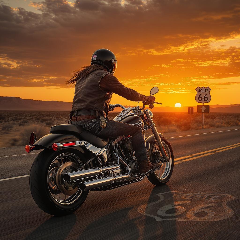 Ultra-realistic portrayal of a rugged biker cruising on a classic Harley Davidson along Route 66, captured at sunset. The scene is viewed from the side, with vibrant hues of the setting sun casting dramatic shadows and reflections on the motorcycle's chrome finish. The open road stretches ahead, flanked by vast desert landscapes and iconic road signs. The biker, wearing weathered leather gear and a vintage helmet, exudes freedom and adventure in this iconic American journey.