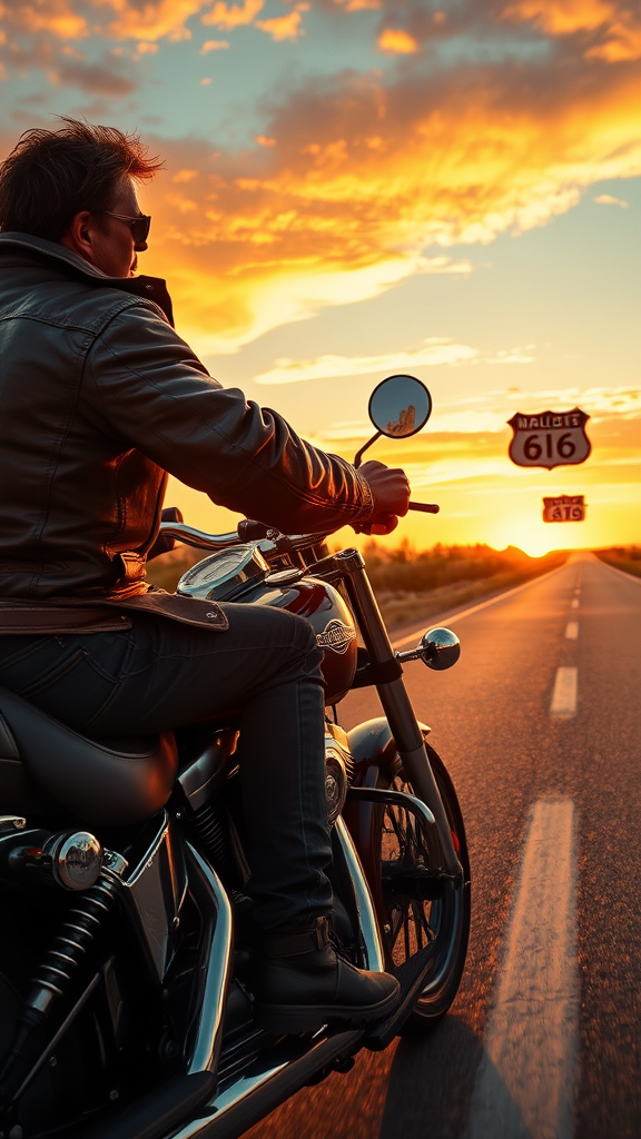 Ultra-realistic portrayal of a rugged biker on a classic Harley Davidson cruising down Route 66 during a breathtaking sunset, detailed side view with a vivid, elongated perspective capturing the golden hues of the setting sun reflecting off the chrome of the motorcycle, the biker's confident posture and worn leather jacket tell a story of freedom and adventure, while the open road stretches invitingly into the horizon, embodying the spirit of the road trip.