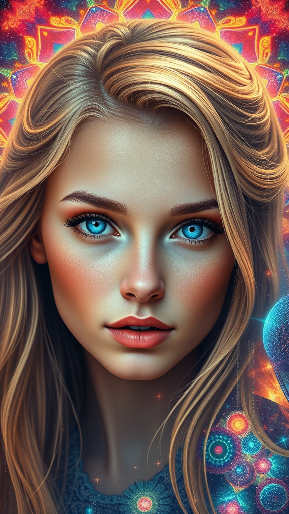 Ultra realistic portrayal of Scarlett Leithold infused with cosmic energy; a kaleidoscope of vibrant colors burst around her, accentuating a beautifully symmetrical face. Her expression is nonchalant yet kind, her round eyes radiate realism and warmth. The composition is tone mapped, intricate, and elegant, showcasing a highly detailed digital painting style. Inspired by the artistry of Artgerm, Greg Rutkowski, and Alphonse Mucha, the work is smooth, with sharp focus, capturing a dreamy and magical atmosphere akin to concept art and illustration. Rendered in breathtaking 4k and 8k resolution, the image exudes an ethereal elegance.