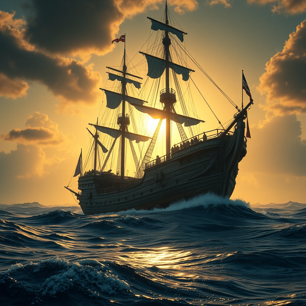 Ultra-realistic sailing ship on tempestuous seas, dramatic interplay of shadows and light illuminating a pale, golden sunrise; cinematic lighting enhances the ship's weathered and battered appearance, captured from a low angle that emphasizes its grandeur. The scene trends on digital art platforms, rendered in stunning 4k resolution with hyper-realistic focus and extreme detailing. Utilizing Unreal Engine 5 for a cinematic masterpiece, this intricate artwork draws inspiration from Studio Ghibli's whimsical artistry and the evocative landscapes of John William Turner, resulting in an immersive and breathtaking visual experience.