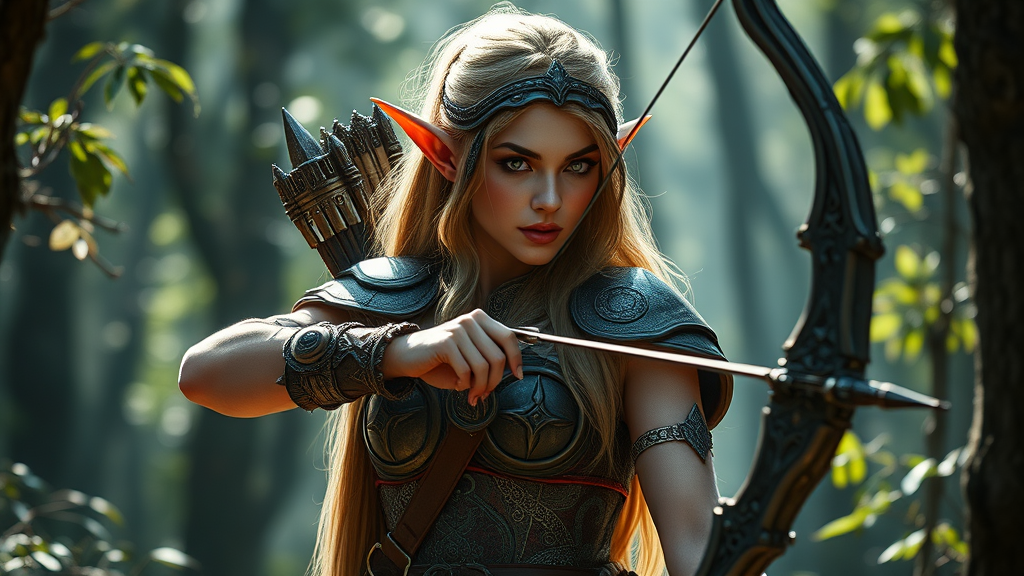 Ultra-realistic stunning elf huntress with a bow amidst an enchanting forest setting, inspired by RPG and fantasy themes, evoking the spirit of dungeons & dragons; features elaborate and intricate attire, with exquisite detailing in her armor and accessories. She stands poised in dynamic lighting that casts dramatic shadows, highlighting her ethereal beauty and keen focus, all captured in cinema-quality 8k resolution, offering a sense of vibrant realism and depth.