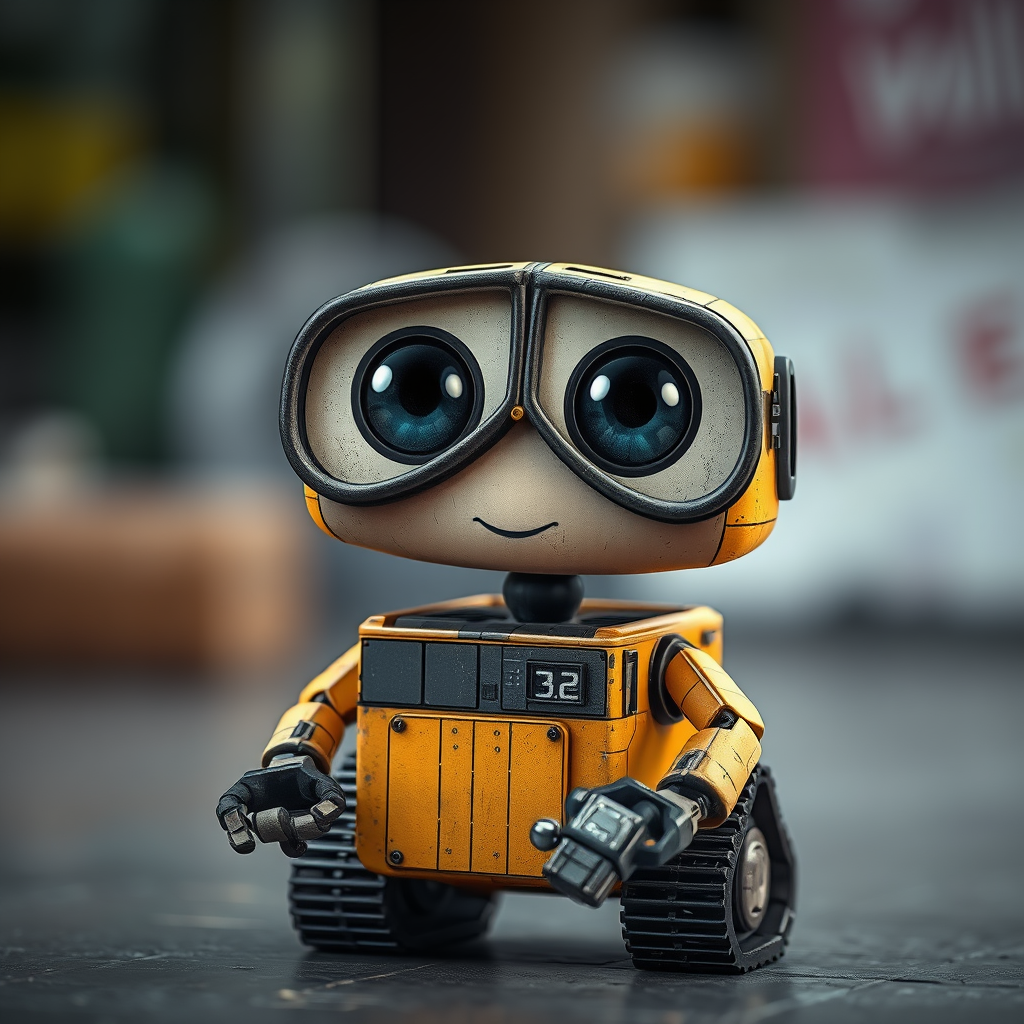 Ultra-realistic ultra-detailed photorealistic image of a charmingly nerdy and dorky baby Wall-E with exaggerated cartoonish features, high-definition textures, bright HDR lighting, playful raytracing effects, intentionally blurry background, hand-drawn sketch elements, slightly low resolution, whimsical anatomy, moderate quality, quirky proportions, softly out of focus with subtly creative elements while retaining the essence of the character.