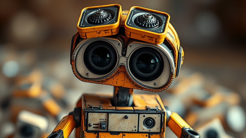 Ultra-realistic ultra-detailed photorealistic image of an adorable and quirky nerdy baby Wall-E, showcasing a high level of detail with HDR effects and subtle raytracing. The image includes intentionally blurry elements to create an artistic contrast with sketch-like textures and a playful nod to low resolution. The depiction features delightfully exaggerated features, with whimsy in its slightly unusual proportions and areas gently out of focus, blending an engaging mix of quality levels to enhance the character's charm.
