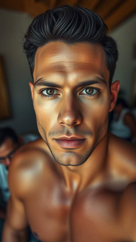 Ultra-wide angle capturing a distant yet majestic view of an elegant and handsome Mexican man; his complexion flawless and his physique muscled with striking definition. His face is highly detailed, exuding charisma with perfect eyes and round, captivating pupils. Employing ray tracing technology for an immersive visual effect, the scene is bathed in dramatic lighting, enhancing soft details and textures. The imagery is rendered in stunning HDR and high-definition 4K and 8K quality, drawing inspiration from the styles of Edmund Blair Leighton, Brom, Charlie Bowater, and Tom Bagshaw, with an emphasis on facial features reminiscent of Sargent's work.