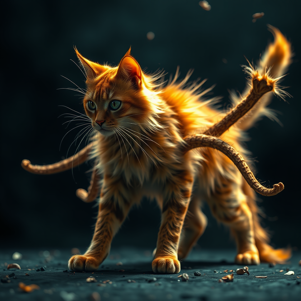 Ultra wide angle focus, dark epic background with lifelike moody golden fur design, dynamic full-length shot of a cat in a striking pose, featuring hyperdetailed lighting art and insane intricate details. The scene draws on gothic and fractal elements, presenting a blend of beauty and distortion. The anatomy is intentionally distorted with a mix of extra and missing limbs, creating an unsettling, mutated appearance. Disconnected and floating elements enhance the surreal quality, while maintaining a cinematic, blurry, and darkly captivating atmosphere.