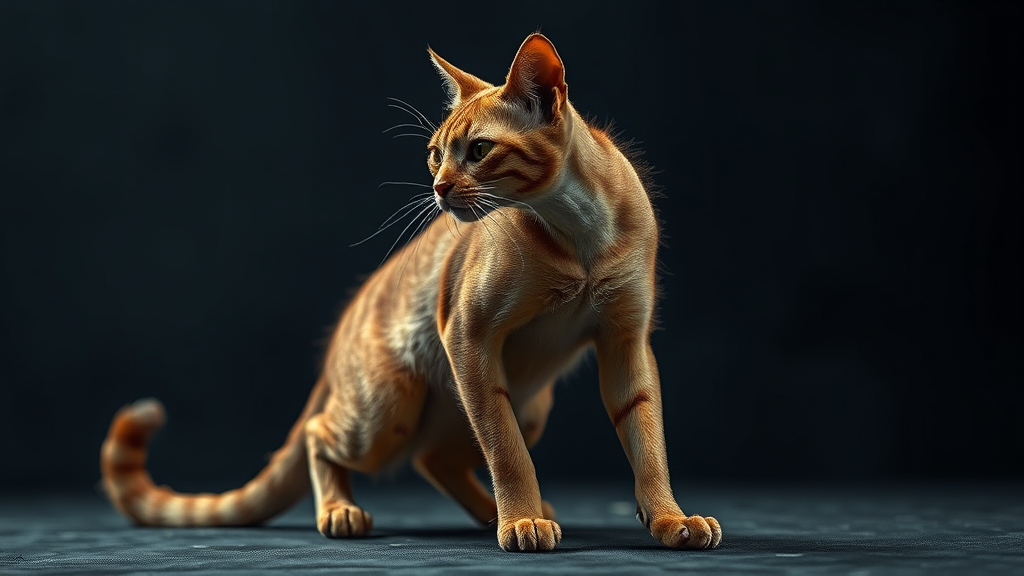 Ultra wide angle in focus dark atmospheric backdrop stunning realistic moody golden fur design dynamic pose of a cat full length shot hyper intricate details cinematic lighting art gothic inspiration fractal influences dark tonality intentionally flawed anatomy with creative mutations and odd proportions surreal disjointed limbs and unexpected configurations merging beauty with unsettling elements.