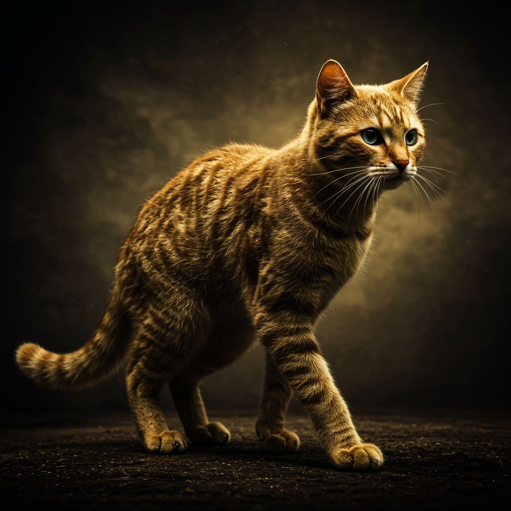 Ultra wide angle, in focus, dark epic background, lifelike yet surreal moody golden fur design, dynamic pose of a cat, showcasing the full and whole body in a full length shot, hyper details, artistic lighting, cinematic feel, intricate hyperdetailed goth elements, fractal-inspired features, dark ambiance, with hints of distorted anatomy, unexpected mutations, and disjointed limbs, blending beauty with chaos, creating a fusion of elegance and grotesque, with elements appearing both detailed and abstract in a dreamlike state.
