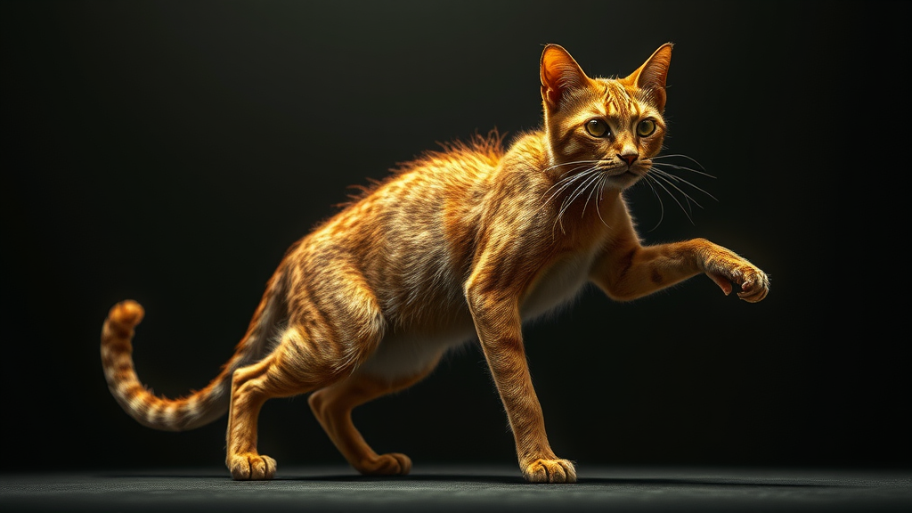 Ultra wide angle, in focus, epic dark background, stunning lifelike depiction, moody golden fur, dynamic pose of a cat, entire body captured in full length shot, incredibly detailed, artistic lighting, cinematic, extraordinary detail, intricate design, gothic elements, fractal patterns, atmospheric shot, surreal anatomy with unexpected twists, additional limbs, missing limbs, floating parts, disjointed limbs, unusual mutations, intriguing distortions, striking blurry areas, unexpected amputations.