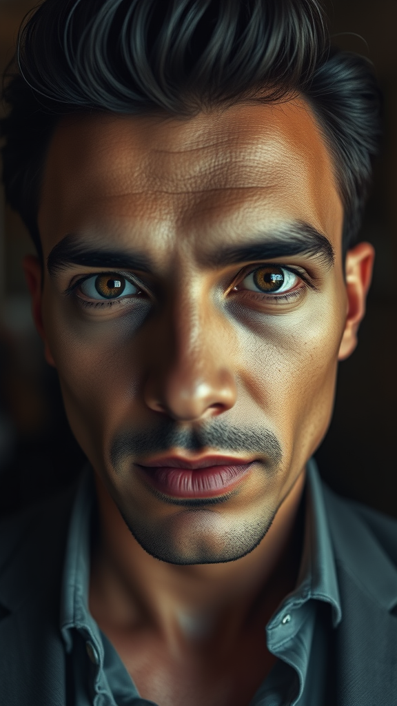 Ultra-wide angle perspective capturing a sophisticated and elegant Mexican man, possessing a strong, muscular build with a flawless complexion, strikingly handsome with meticulously detailed facial features. His eyes are captivating, perfectly shaped with ideal round pupils, enhanced through ray tracing techniques. The scene is enveloped in dramatic lighting, highlighting the soft yet defined details of his face. The image is rendered in HDR, showcasing true-to-life colors, and high definition in 4K and 8K resolution. Inspired by masterful techniques and styles of Edmund Blair Leighton, Brom, and Charlie Bowater, with facial detailing akin to Tom Bagshaw and Sargent, offering a visual blend of historical and contemporary artistry.