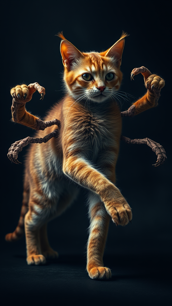 Ultra wide angle, sharp focus, dark epic background, lifelike yet moody golden fur design, dynamic pose of an entire cat's body, full length shot, hyper-detailed lighting art, cinematic feel, intricate details, gothic vibes, fractal-inspired, dark atmosphere, elements of distorted anatomy, surreal extra limbs, curious amputation, and surreal mutations blending into an ugly-beautiful juxtaposition, blending realism with abstract grotesque, creating an enigmatic, evocative visual.