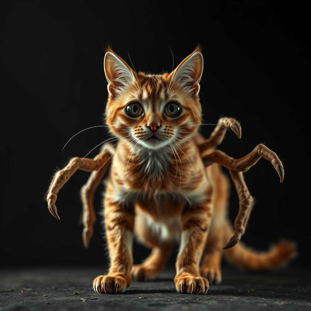 Ultra wide angle, sharply in focus, set against a dark, epic backdrop, featuring a stunningly lifelike cat with moody golden fur. Captured in a dynamic pose, the entire body is showcased in a full-length shot with cinematic lighting. Intricate and insane levels of hyper-detailed texture create a gothic, fractal-like appearance. Emanating a mysterious and moody aura, the cat appears with distorted features, including strange anatomy and unusual limb placements, giving an otherworldly, mutated feeling. The disjointed limbs and blurred lines contribute to an eerie, yet oddly captivating presence, making for a beautifully grotesque and surreal portrait.