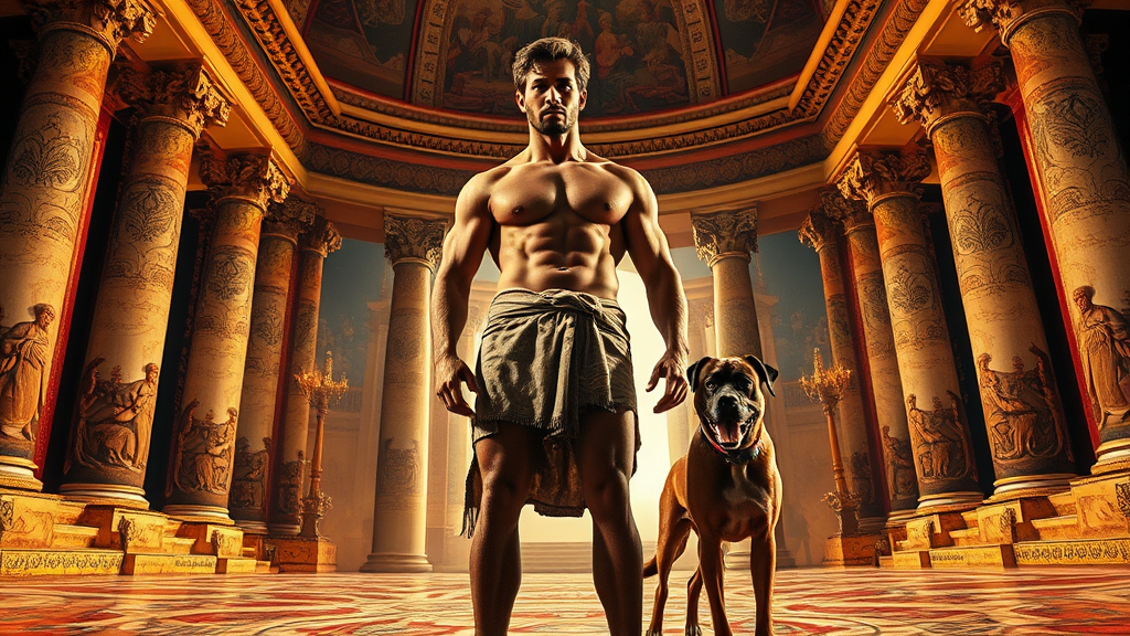 Ultra-wide angle view capturing a muscular and handsome man set against an elaborate Ancient Rome backdrop, his powerful legs firmly planted as he stands with a flawless dog by his side. Dressed in a finely textured loin cloth, his striking eyes and perfectly chiseled face are framed by dramatic lighting that enhances every detail. The scene bursts with vivid, brilliant colors that echo the intricate and orientalist artistry akin to John William Waterhouse, Edwin Longsden Long, Theodore Ralli, and Nasreddine Dinet, creating a cinematic and hyper-realistic atmosphere. The image is masterfully sharpened with meticulous attention to detail, embodying a sense of grandeur and dynamism.