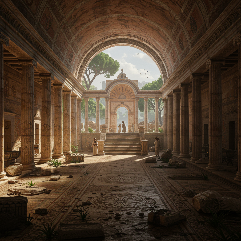 Ultra-wide angle view capturing the grandeur of an ancient Roman landscape, devoid of people, influenced by the orientalist intricacies of Edwin Longsden Long, Theodoros Rallis, and Nasreddine Dinet. The setting is infused with cinematic, hyper-realistic detail, showcasing the timeless architecture and lush surroundings bathed in dramatic, photo-realistic lighting. The scene balances historical authenticity with high-definition artistry, where every column, mosaic, and texture is rendered with meticulous precision, inviting the viewer into a world where past grandeur meets present-day visual mastery.