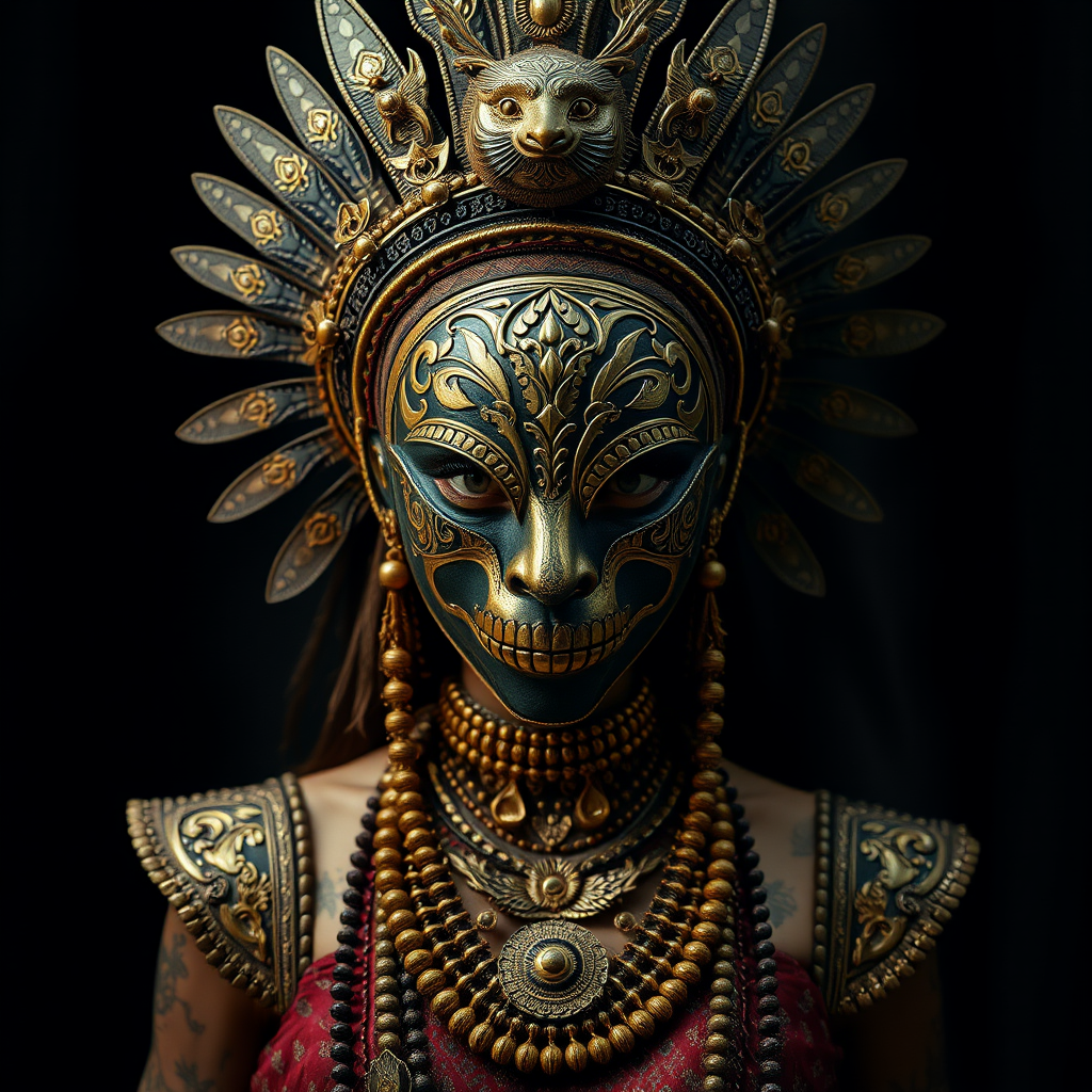 Ultra wide angle view of a stunningly lifelike scene, set against a dark and dramatic backdrop. A woman adorned with an intricately designed tribal mask stands as the centerpiece, her presence amplified by exquisite golden embellishments. The cinematic quality of the scene reveals a wealth of minute and obsessive details, making each element hyperdetailed and captivating in its complexity.