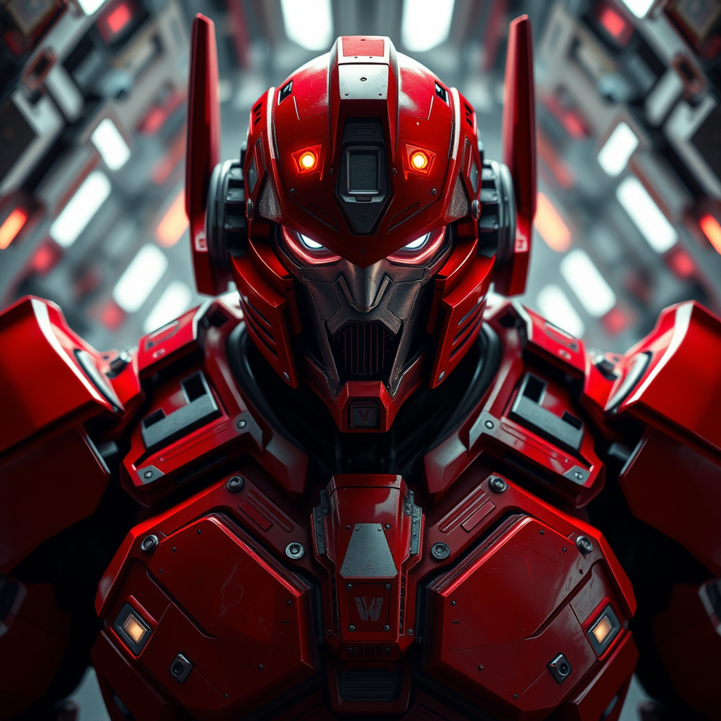 Ultra-wide perspective image featuring a fierce warrior clad in red sci-fi armor, complete with a cyber helmet adorned with glowing lights on the mask. The full body armor is designed for insulation, exuding an aura of anger and readiness. The warrior stands in an active pose, showcasing strength reminiscent of Optimus Prime. The bald-headed figure is surrounded by an intricate array of fine details. Set against the backdrop of a spaceship, the scene captures the moody and dark tone of a cinematic sci-fi movie. The photograph utilizes natural light and photorealistic rendering techniques, with ray tracing enhancing the depth, ensuring the highest quality and detail in 8K Ultra-HD resolution. The image maintains a third-person view, incorporating a blur effect and long exposure to emphasize dynamic movement. The composition is defined by moody and cinematic lighting, creating a dramatic and immersive atmosphere.