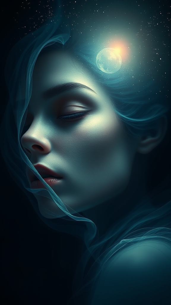 Ultradetailed artistic photography, midnight essence, starlit sky, exquisite face, ethereal, radiant, subtly illuminated, elegance, shimmer, contrasting shadows, oil on canvas texture, refined brushwork, fluid, ultra high resolution, 8k clarity, unreal engine 5 realism, razor-sharp focus, inspired by the art of Alberto Seveso, Artgerm, Loish, with a touch of sci-fi elements, intricate surreal masterpiece, enigmatic, cinematic matte painting style, embodying the golden ratio, making waves on cgsociety, elaborate, grand, trending on Artstation, influenced by Artgerm, H. R. Giger, and Beksinski, meticulously detailed, vivid, cinematic character render at its finest, ultra quality CGI model, 3D artistry, utilizing Octane rendering technology, avoiding pitfalls of low resolution, and ensuring flawless anatomy with balanced proportions, free of unwanted visual distortions or anatomical inconsistencies.