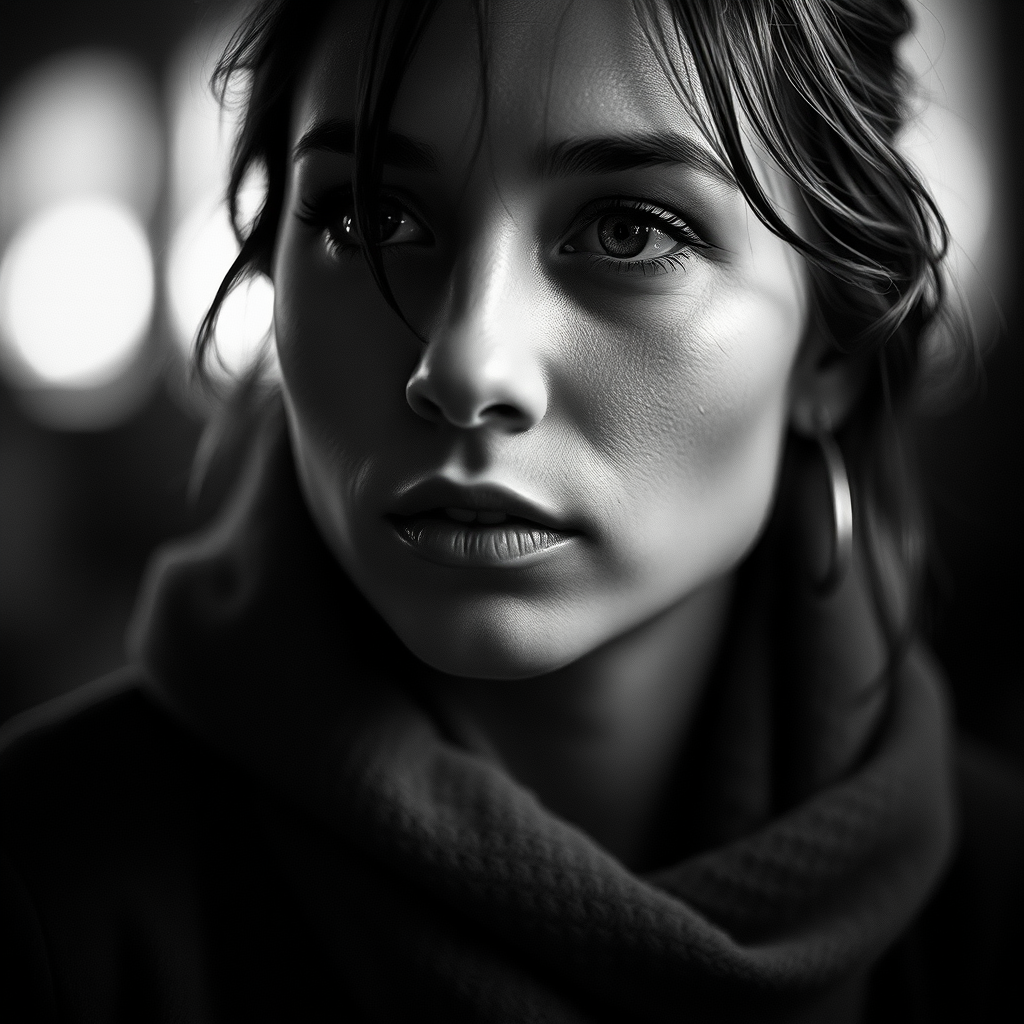 Ultrarealistic portrait capturing the essence of cinematic lighting, an award-winning black and white photograph, shot with an 80mm lens, subtly enhanced with a touch of artistic flair to evoke depth and emotion, while maintaining the foundational elements of easynegative and deepnegative for a striking visual impact.