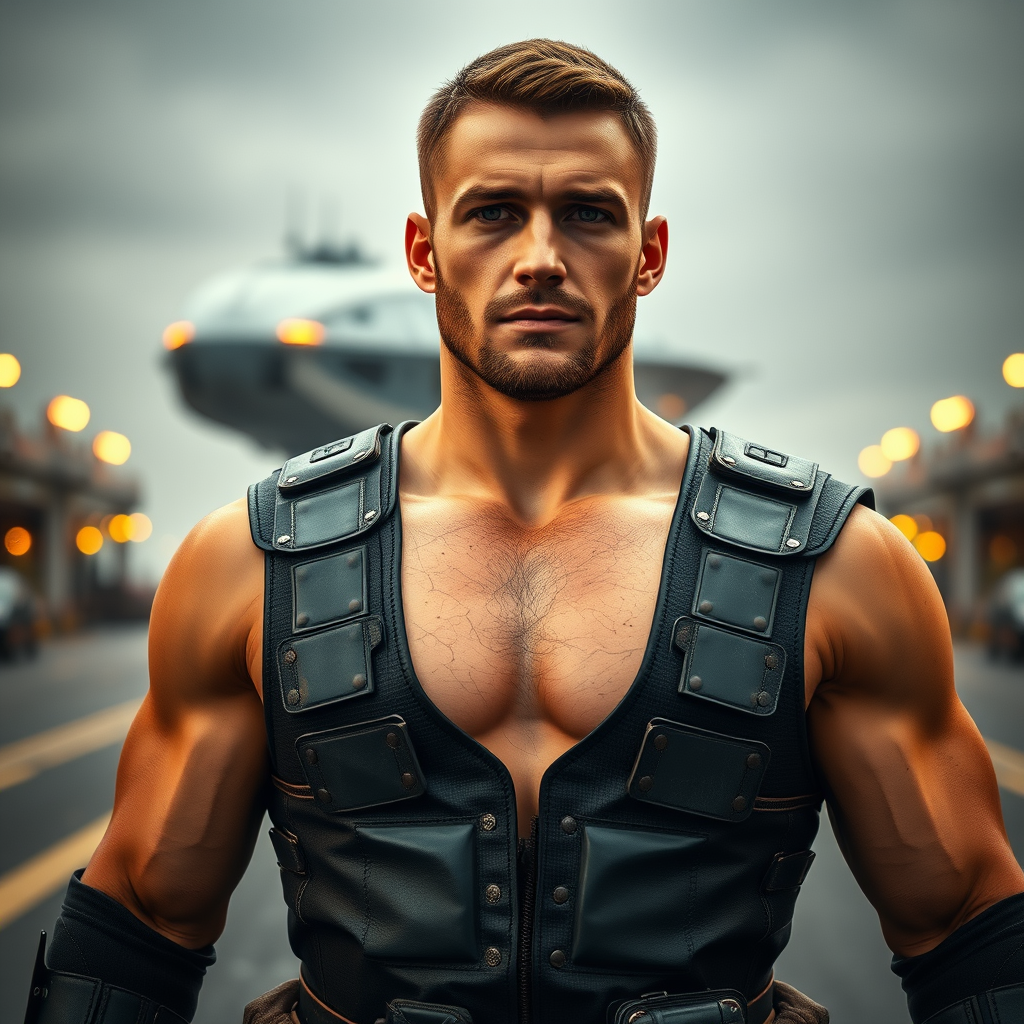Ultrarealistic portrait photograph capturing a full-body view of a 28-year-old Israeli Caucasian male, showcasing strong, alpha male characteristics with defined muscles and a hairy chest. The man possesses a smaller head with shiny, vibrant hair. Shot with a Hasselblad X1D - 50c, this cinematic image features a wide field of view, highlighting the subject in full-length from head to toe. The setting is a sci-fi spaceport with a futuristic ship launching in the background, creating a dynamic, overcast atmosphere. The subject sports intricately detailed plate leather armor, emphasizing natural textures under moody, cinematic lighting. Captured with hyper-realistic detail, the photograph conveys an action-packed, epic scene using volumetric lighting and a blur effect to enhance realism. The ultra-HD, 8K quality ensures the highest level of detail and photo-realism, drawing inspiration from the dramatic style of 'pursuit' by Gesaffelstein. The image is devoid of common flaws such as low resolution or poor anatomy, focusing instead on achieving the pinnacle of realistic, cinematic rendering.