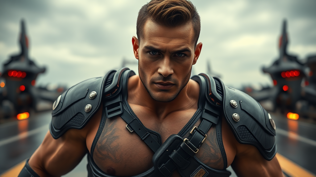 Ultrarealistic portrait photograph capturing the full body of a 28-year-old Israeli Caucasian male with striking features and a confident presence. The scene offers a wide field of view, highlighting the man's muscular, well-defined physique with a naturally hairy chest and proportionate features, including a slightly smaller head and shiny, well-groomed hair. The setting is a cinematic moment at a futuristic spaceport, where a sci-fi ship is launching against an overcast sky. He wears intricately detailed leather armor, emphasizing his alpha male dominance. The composition is hyper-realistic with vibrant colors, enhanced by natural and moody cinematic lighting. Volumetric effects and an action-oriented pose create an epic, movie-style scene. The photograph boasts 8K Ultra-HD quality, with rich textures and photorealistic rendering, capturing the essence and energy of a sci-fi action narrative in the highest quality possible. The image avoids common flaws such as poor anatomy or low resolution, maintaining a focus on natural beauty and detailed craftsmanship.