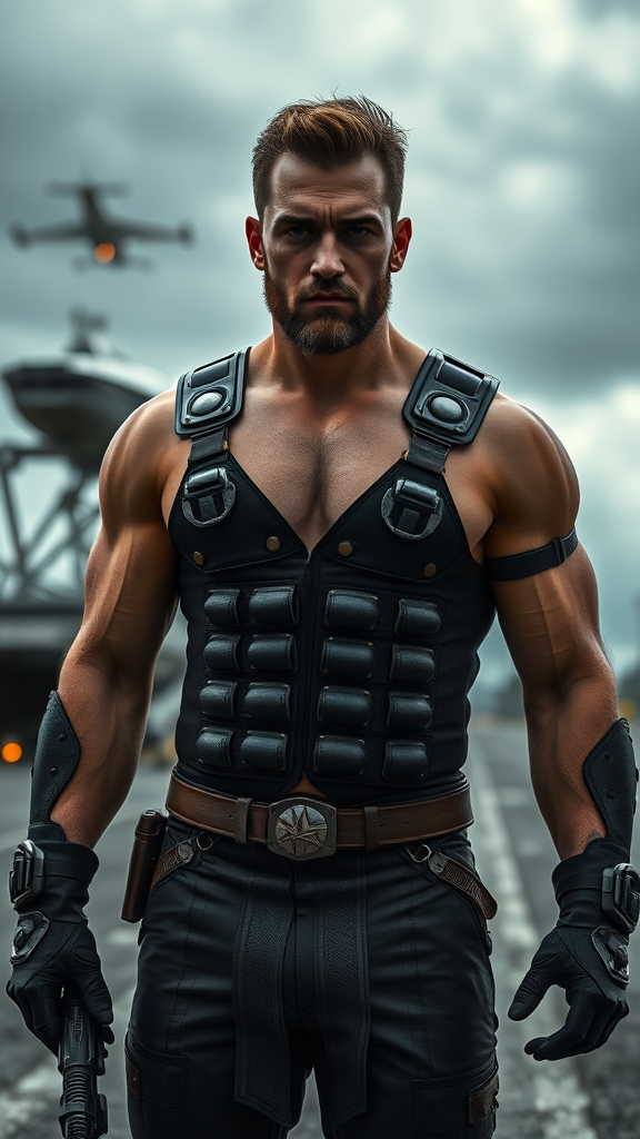 Ultrarealistic portrait photograph showcasing a full-body view of a 28-year-old Israeli Caucasian male, exhibiting a dominant and alpha presence with defined muscles and a well-balanced physique. The subject features a hairy chest, slightly smaller head, and shiny hair, all captured in a wide field of view. The scene is set at a spaceport with the dramatic backdrop of a sci-fi ship launching into the overcast sky. The man is adorned in intricate plate leather armor, highlighting his strong build, and standing in an action pose that conveys a cinematic and epic feel. Natural and moody lighting enhances the photorealistic details, while volumetric and cinematic lighting effects create a dynamic atmosphere. The image is rendered in 8K Ultra-HD, ensuring hyper-realism and vibrant detail, emphasizing every texture and element in the scene. The composition is inspired by the style of 'pursuit' by Gesaffelstein, with a focus on capturing a moment of intense energy and drama, framed like a movie still with natural light and subtle blur effects adding depth and realism.