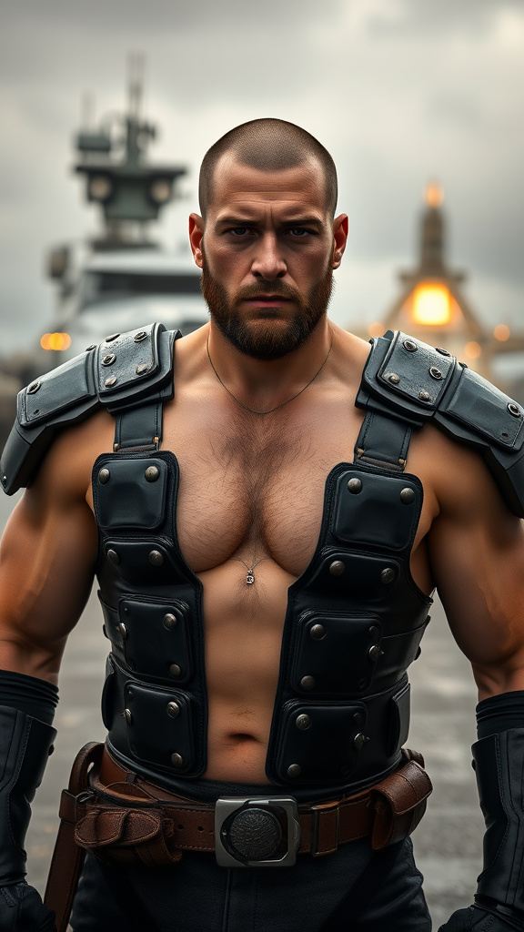 Ultrarealistic portrait photograph showcasing a full-body triangulation of a 28-year-old Israeli Caucasian male with a dominant, muscular physique and a hairy chest. The subject boasts a smaller head and shiny hair, captured with a Hasselblad X1D - 50c, offering a cinematic feel. The scene features a wide field of view in a long shot, showing the full body from head to toe. This hyper-realistic image is set against a sci-fi spaceport backdrop, with a futuristic ship launching in the background. The model dons intricately detailed plate leather armor, giving off a formidable alpha male presence. The setting is overcast with moody, natural lighting enhancing the dramatic atmosphere, complemented by cinematic and volumetric lighting effects. The composition is finely detailed with vibrant and ultra-HD quality, featuring a realistic portrayal of textures and natural elements. His pose is action-oriented, encapsulating an epic movie-style scene with precise attention to detail. This high-quality 8K image uses ray tracing for exceptional realism, avoiding any digital artifacts, providing a seamless blend of creative and lifelike qualities.