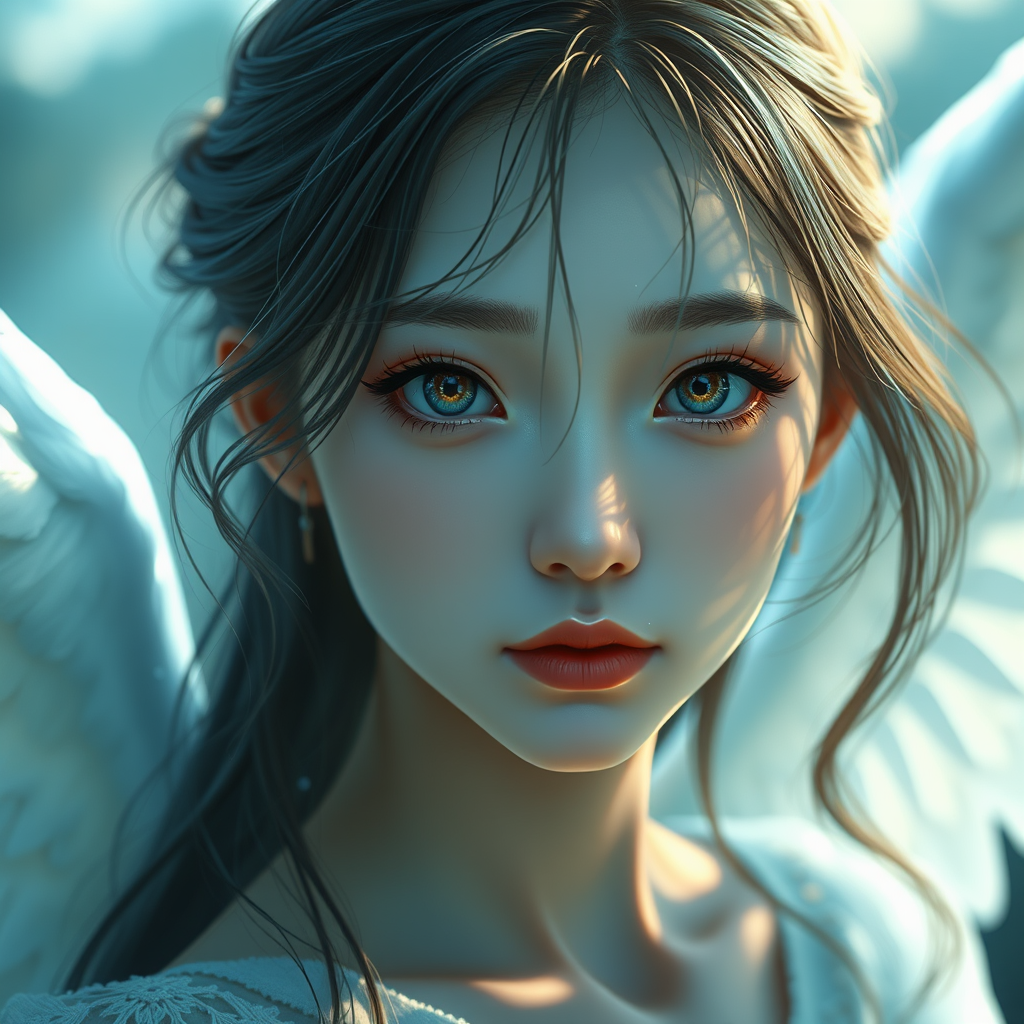 ulzzang-inspiration, 6500-v1, stunning quality, masterpiece illustration, exquisitely delicate and beautiful, ultra-detailed CG, harmony, 8k desktop background, breathtaking, finely detailed, artwork of the highest order, ultra-detailed cinematic CG harmony in 8k, intense resolution, astonishingly high-resolution, massive file size, ultra-detailed, high-resolution, strikingly detailed girl, intricately detailed eyes and face, mesmerizing eyes, gentle illumination on face, theatrical lighting, one girl, translucent, engaging the viewer, in a natural setting, angelic wings.