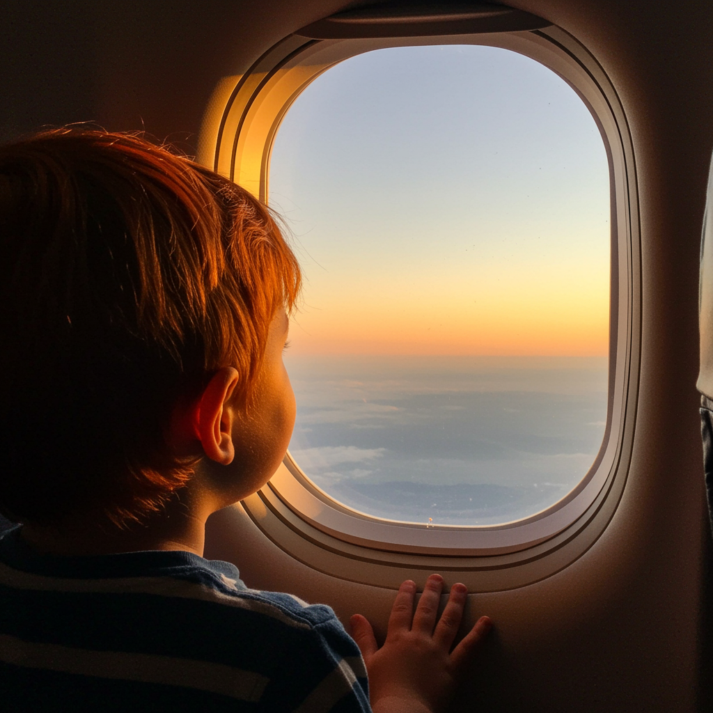 Un niño de cabello rizado y rojizo observa con asombro las vistas a través de la ventana del avión. Desde su asiento, se percibe la espalda del pequeño viajero mientras su cabello resplandece con reflejos dorados bajo la luz del atardecer. El cielo al otro lado del cristal está teñido de un cálido tono dorado por el sol poniente, intensificando el color anaranjado de sus rizos. El ambiente es sereno y mágico, capturando un momento de pura admiración y curiosidad infantil ante la vasta extensión del cielo.