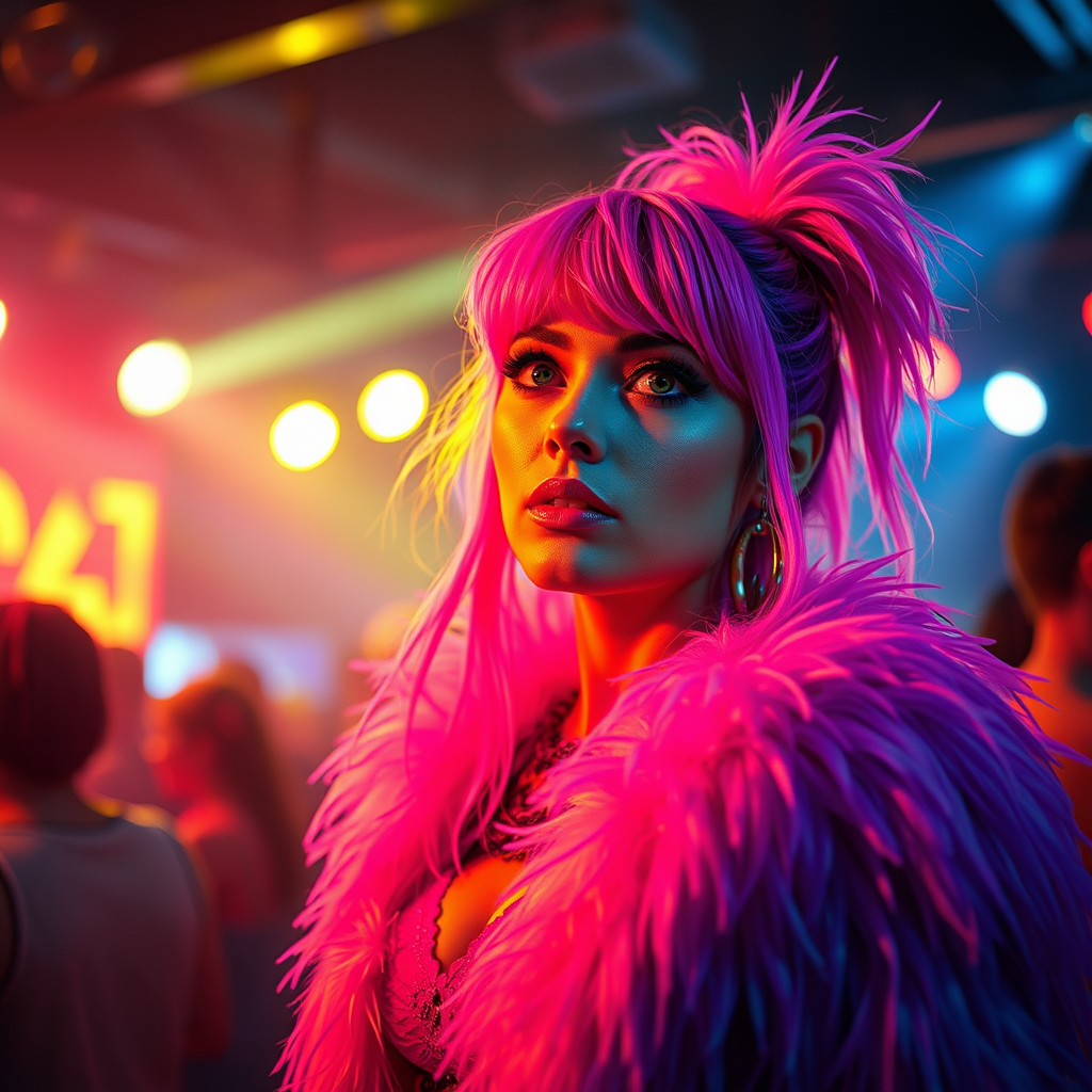 Unaware woman in a vibrant rave party outfit, adorned with a feathered jacket and sporting vivid pink hair, gazing wide-eyed amidst dazzling party lights. Set indoors with high saturation, the scene captures soft focus and hyper-detailed elements, enveloped in cinematic lighting and inspired by concept art aesthetics.