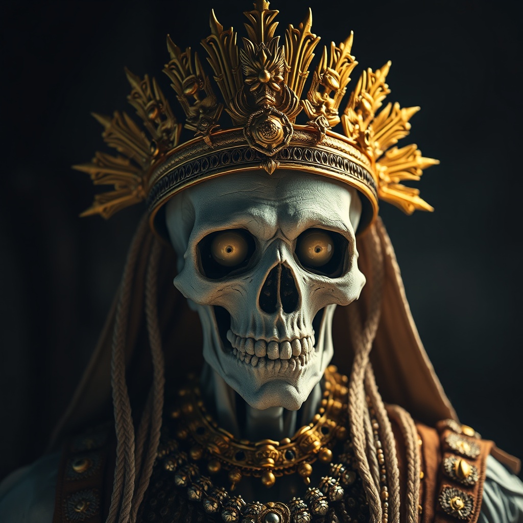 Undead monarch adorned with a regal golden crown and an array of opulent necklaces, a radiant headdress resembling sunrays crowning his head, possessing lifeless, milky white eyes and parched, withered skin, captured in striking and dramatic lighting with a photorealistic touch, 8k resolution, with a vertical aspect ratio.