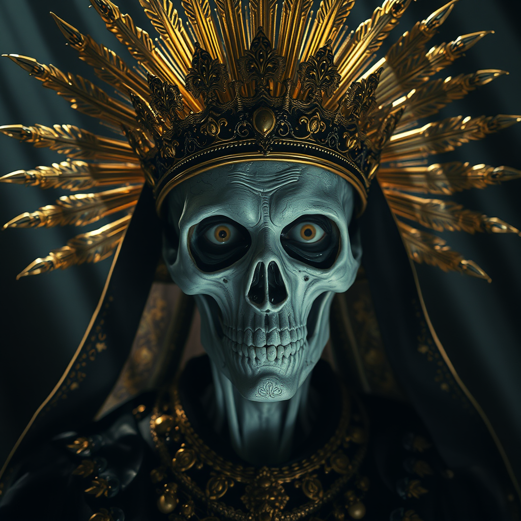 Undead monarch adorned with a regal golden crown and opulent necklaces, crowned with a radiant sunbeam headdress, lifeless alabaster eyes piercing through shadows, desiccated pale skin marked by the passage of time, enveloped in dramatic chiaroscuro lighting, hyper-realistic detail, ultra-high resolution --ar 9:16 --s 750.
