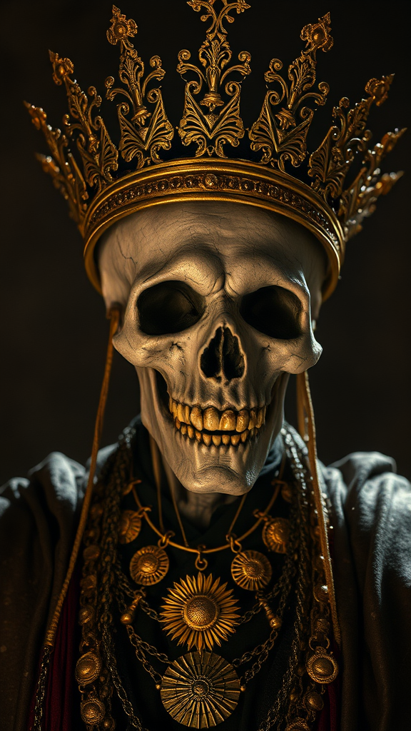 Undead monarch in resplendent attire, with tattered golden crown askew, delicate filigree necklaces tangled around his withered neck, sunburst-patterned headdress with gold accents glinting in the eerie, moonlit glow, dead eyes sunken into shadowy sockets, skin parched and cracked like dry earth, the overall effect enhanced by the dramatic, high-contrast lighting, capturing every detail in a photorealistic 8K resolution image, shot in 9:16 cinematic aspect ratio, set in a dark, mystical environment with a 750-pixel-per-inch resolution.