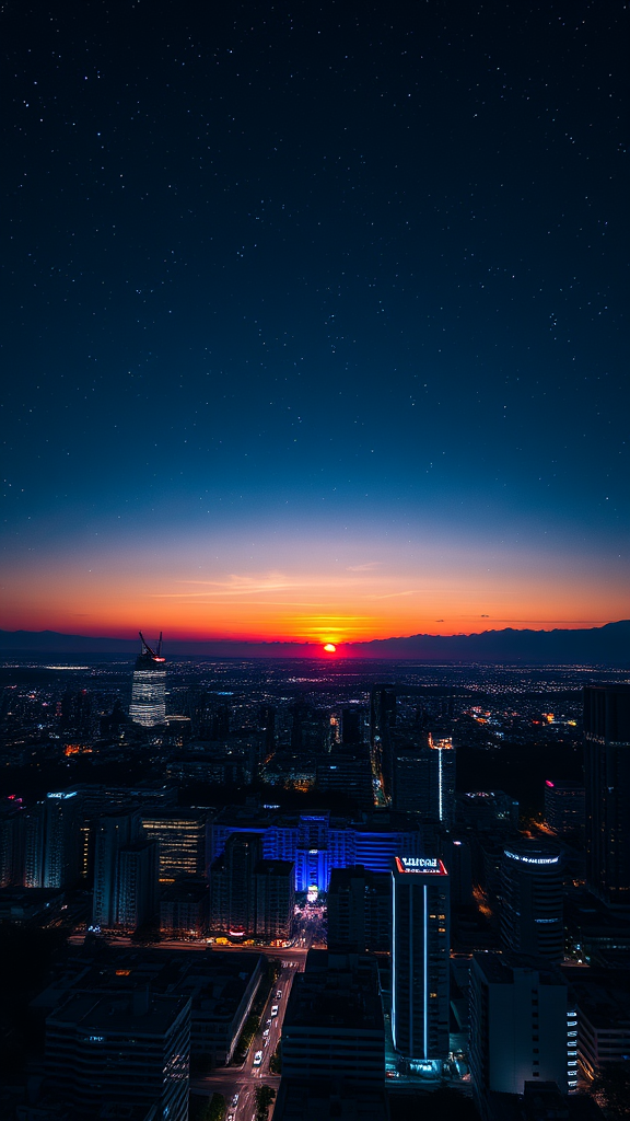 Under a canopy of twinkling stars, the vibrant city comes alive, its lights mirroring the constellations above as the sun dips below the horizon, painting the sky in hues of orange and pink.