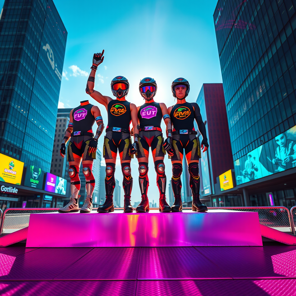 Under the blazing summer sun, three riders stand triumphantly on a neon-lit podium, their futuristic gear adorned with glowing logos of various cyberpunk clubs. The bold colors of their outfits reflect the intense sunlight, casting vibrant reflections on the metal surface below. The camera's elevated angle captures the scene from above and slightly forward, emphasizing the dynamic lines and electric ambiance. The riders, with sleek visors and augmented limbs, exude confidence amidst the backdrop of towering holographic skyscrapers and digital billboards flashing in the distance.