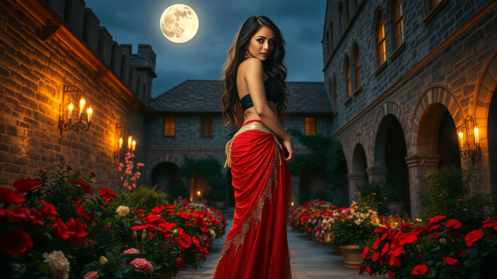 Under the glow of a full moon, a captivating beauty stands amidst a medieval castle courtyard at dusk, her red and gold belly dancer's outfit sparkling in the interplay of moonlight, torchlight, and candlelight. The natural light of the moon envelops her, highlighting her sensuous pose. She stands barefoot, surrounded by a lush array of vibrant flowers, her gaze bewitching the viewer. A sleek black band encircles her neck, adding an air of mystery. Her raven hair flows in wavy cascades down to her hips. With her back to the camera, she glances over her shoulder, effortlessly drawing the viewer's eye. Captured with a Leica M10 and a Helios-44 58mm f/2 lens, set at F2.8, this fine art color photograph boasts deep, rich tones and exquisite highlights. The subtle sunlight accentuates her radiant presence as the diffuse glow filters through her hair, emphasizing the elegant curves of her silhouette.