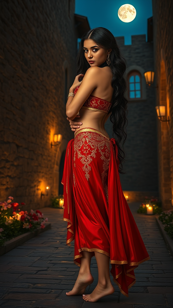 Under the glow of moonlight and flickering candlelight, a mesmerizing beauty stands, surrounded by the stone walls of a medieval castle courtyard at dusk. Her red and gold belly dancer outfit shimmers in the mixed lighting, the intricate patterns catching the eye. Barefoot on ancient cobblestones and encircled by blooming flowers, she strikes a captivating pose, her body bathed in the luminous embrace of the full moon. An elegant black choker adorns her neck, adding a touch of enigma. Her raven hair falls in soft waves to her hips, catching the subtle light and accentuating her graceful form. With her back to the camera, she turns her head slightly, her enchanting gaze meeting the viewer's. Taken with a Leica M10 and Helios-44 58mm f/2 lens at F2.8, this fine art color photograph is rich with deep tones and vivid highlights. The moonlight accentuates her vibrant expression, while delicate light filters through her dark locks, outlining the gentle curves of her silhouette.