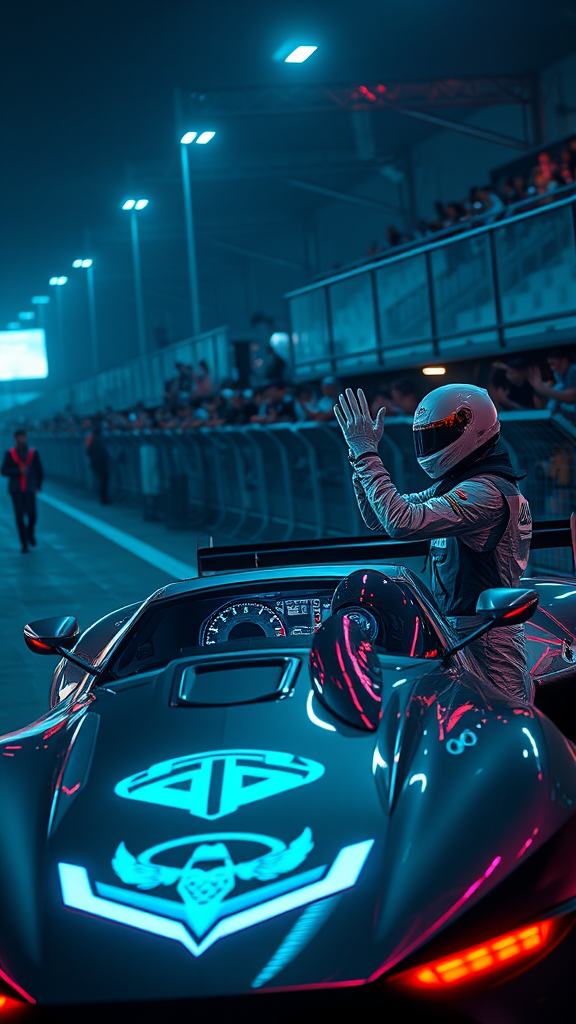 Under the neon glow of a cyberpunk summer, a sleek race car adorned with the glowing emblem of an elite auto club sits idle on the futuristic track. Next to it, a racing driver with a glistening metallic suit adjusts his cybernetic helmet with one hand, while energetically waving to the holographic displays of cheering fans with the other. The cockpit is a maze of digital displays, devoid of any human presence, suggesting an advanced AI navigation system. Spectators, some human and others android, spill from the stands and press against the transparent, luminescent barrier that lines the track. The view captures the scene from a slight elevation and a front-side angle, highlighting the vivacious blend of technology and human spirit.
