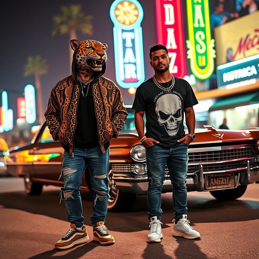 Under the vibrant glow of neon streetlights in a bustling Mexican city, two men exude the charisma and authority of high-profile cartel leaders. One sports the head of a jaguar, wrapped in a custom snakeskin bomber jacket by Gucci, layered over a sleek Balmain hoodie, paired with distressed designer jeans. His counterpart is equally striking in an Amiri skull graphic tee, pristine Yeezy sneakers, and a thick Cuban link chain. They stand confidently beside a vintage lowrider Cadillac, the embodiment of power and avant-garde fashion, casting long shadows that dance across the pavement.