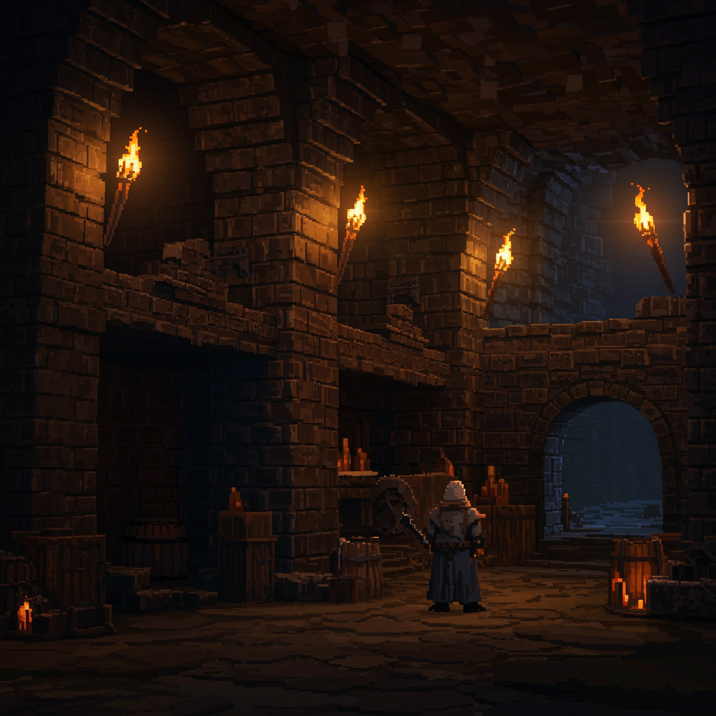 Underground dungeon scene in 64-bit pixel art, illuminated by flickering torches, set in a dark, mysterious night setting, showcasing high detail and HD quality reminiscent of Elden Ring's style, evoking a sense of intricate pixel artistry and depth, presented in 4k resolution with a captivating, immersive atmosphere.