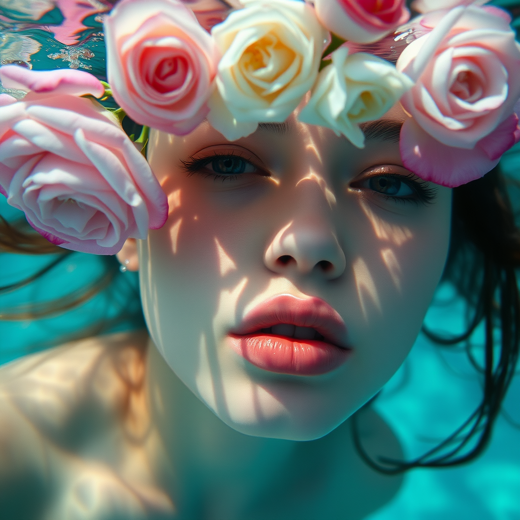 Underwater cinematic photo capturing a girl with water-roses floating above, focusing closely on her lips, showcasing editorial quality with fracturing water light and reflections, employing a deep depth of field, emphasizing blue tones, using kodak portra 800 film qualities, shot with a 105 mm f1.8 lens. Adjust the composition for a 2:1 aspect ratio, with slight artistic enhancements while preserving the original vibe.