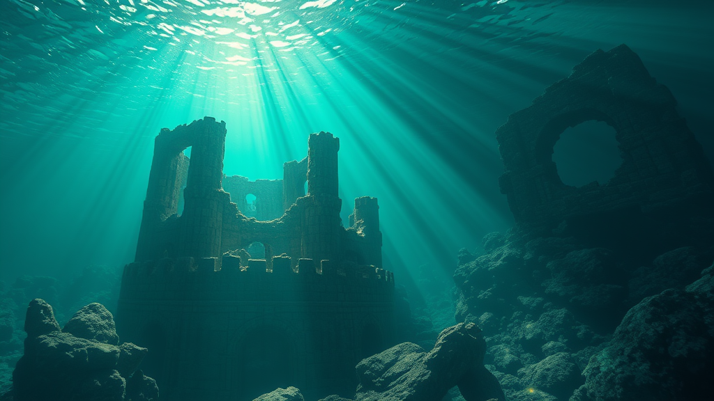 Underwater exploration: The mythical city of Atlantis comes alive with caustics and Snell's window illuminating its ancient ruins. God rays pierce through the ocean's surface, casting an ethereal glow on the leftovers of a once-great empire, captured in a still image. Cinematographic lighting enhances the scene's cinematic appeal with expert color grading. A masterpiece unfolds in a highly detailed cartoon style, featuring subtle blur effects and artistic deformations, all rendered in stunning 3D using Blender.